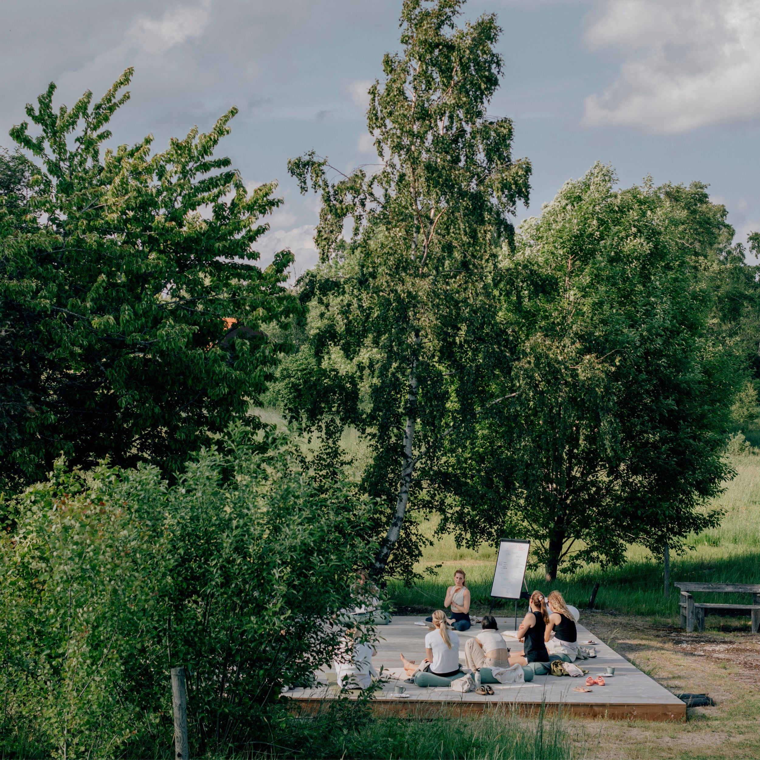 Utbildningen hålls i en rytm som gör det möjligt att både fördjupa och integrera. En stor del sker i retreatform på Lyckhem Skärgårdsretreat, Väddö, där du kliver ur vardagen och får landa djupare i praktik, vila, process och gemenskap. Live online-klasser samt inspelat material mellan träffarna håller praktiken och processen levande. Och eftersom utbildningen sträcker sig över tid finns utrymme att låta det du upplever sjunka in, så att yogan inte bara blir något du gör, utan något du lever.